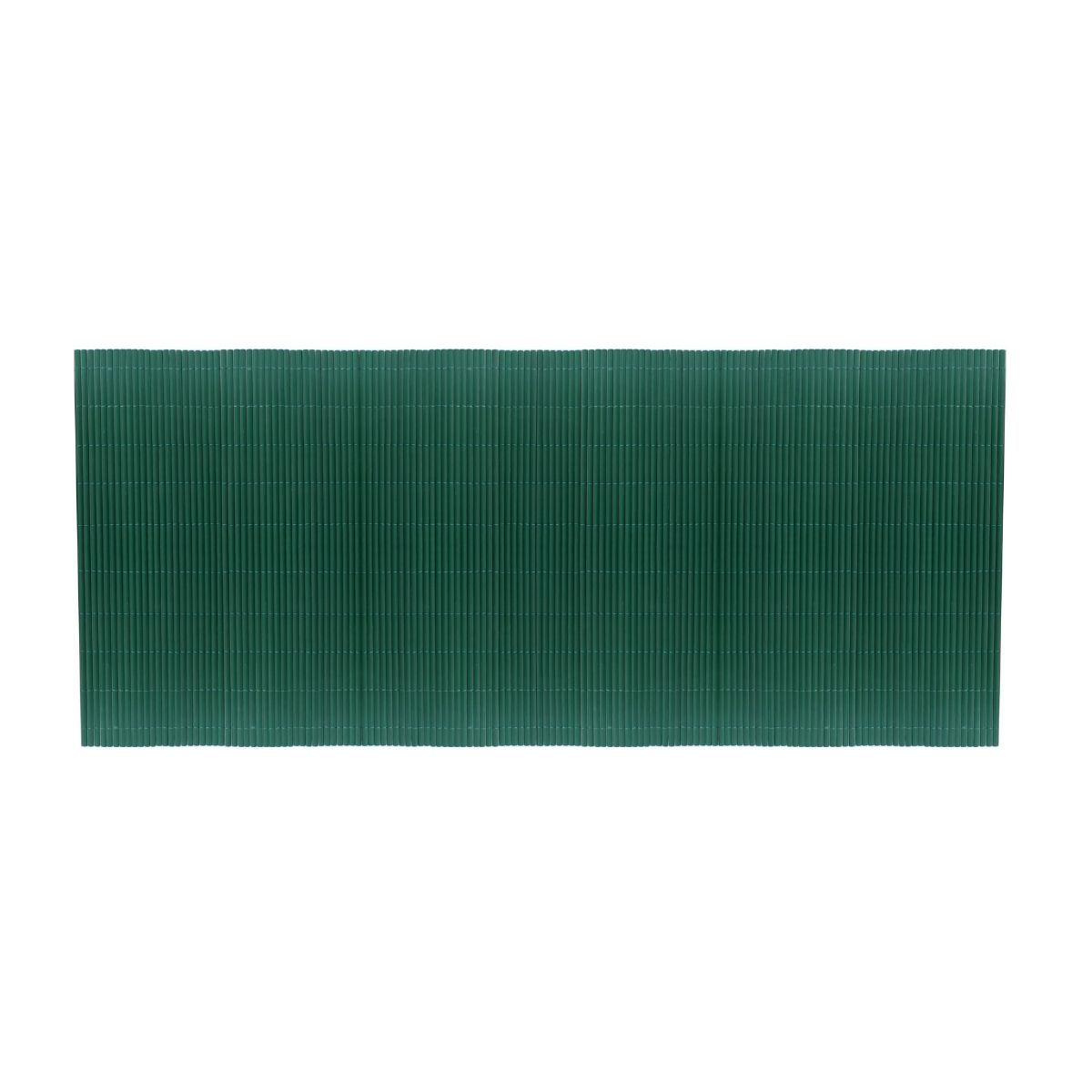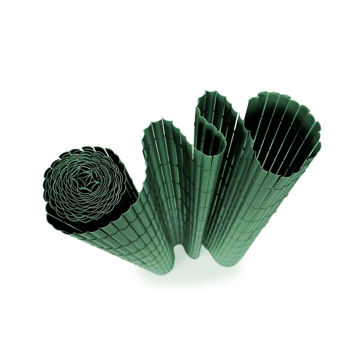 Single-sided PVC reed fencing. Nylon thread weave, in the same color as the product, every 10 cm, glued to the slats. Colors: green, camel, white, taupe, and gray. Density: 0.9 kg/m². 50% recycled content.